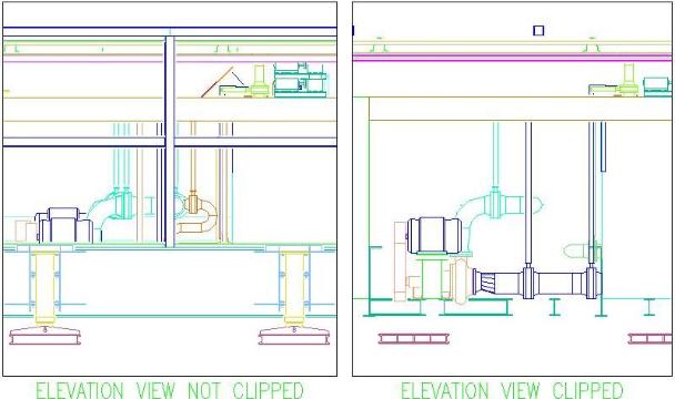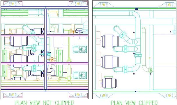 On the left is a typical elevation view looking entirely through the module. The main beams make it impossible to see the pipe beyond them. However the clipped view on the right was created between the two beams so the designer easily sees what area he has to design in.