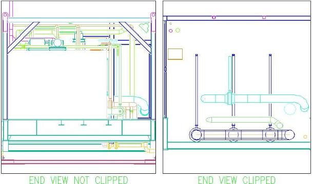 Again on the left is a typical non-clipped view that has the tanks blocking out the ability to see the piping in the middle of the trailer. The view on the right is another clipped view in the X-axis and is between the large tanks that obscure the non-clipped view on the left.